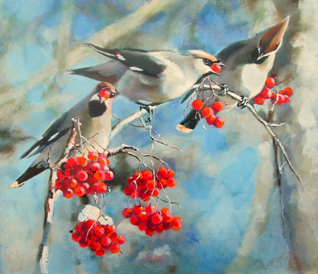 примостились на ветвях и мерзнут,стайки красногрудых снегирей.
