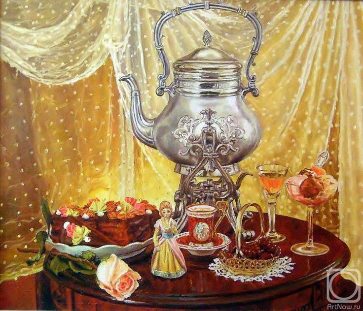 Пьёт восьмую чашку чая.
