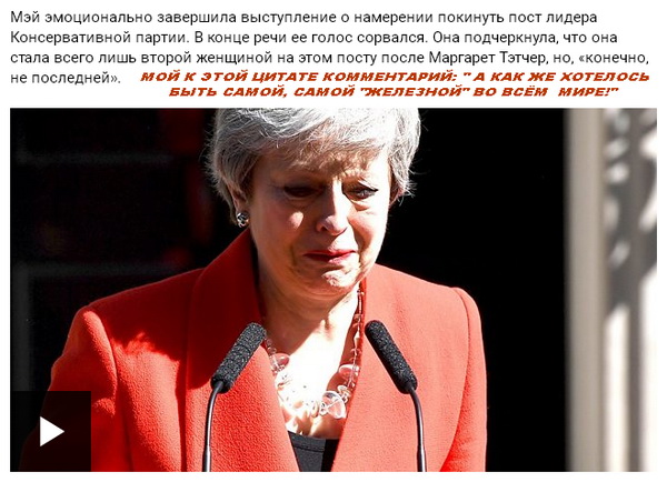 «Мэй эмоционально завершила выступление о намерении покинуть пост лидера Консервативной партии. В конце речи ее голос сорвался. Она подчеркнула, что она стала всего лишь второй женщиной на этом посту после Маргарет Тэтчер, но, «конечно, не последней».