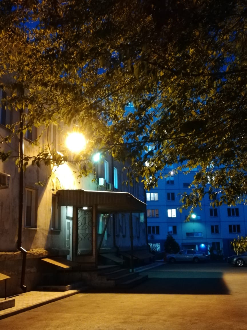 Фонари вечерним светом освещают тихий двор,