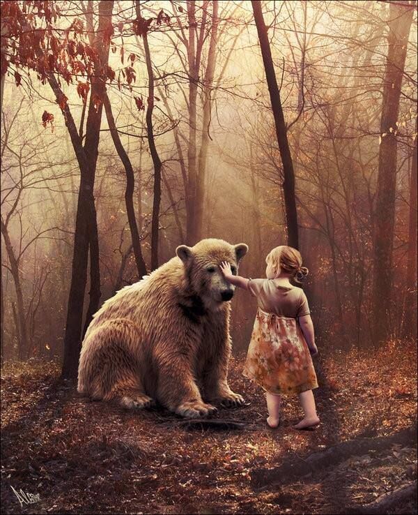 А та не заставила себя долго ждать. Она проснулась и села, и только когда протёрла глаза, увидала лежащего медведя. Естественно, девочка удивилась, но не закричала, не испугалась – и это восхитило зверя. Ей было просто любопытно. Она подошла и, как существо ласковое, умеющее играть, погладила его лежащую на траве морду. Медведь восхитился ещё раз – ему было приятно от этой тонкой и нежной человеческой руки. Он всё больше влюблялся в это существо.