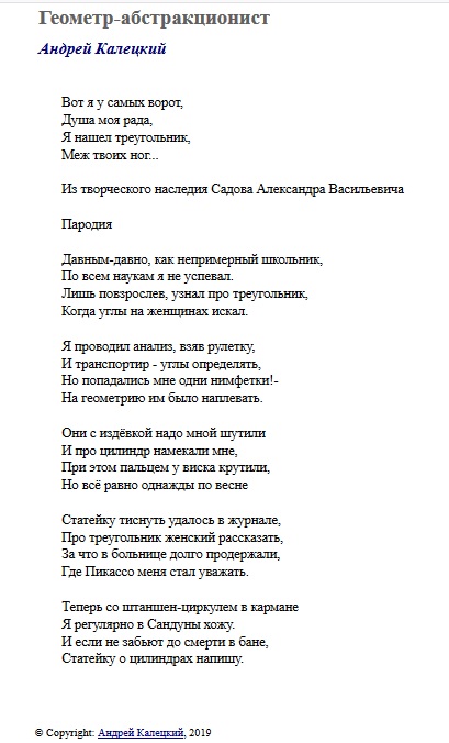 "Теперь со штаншен-циркулем в кармане Я регулярно в Сандуны хожу.