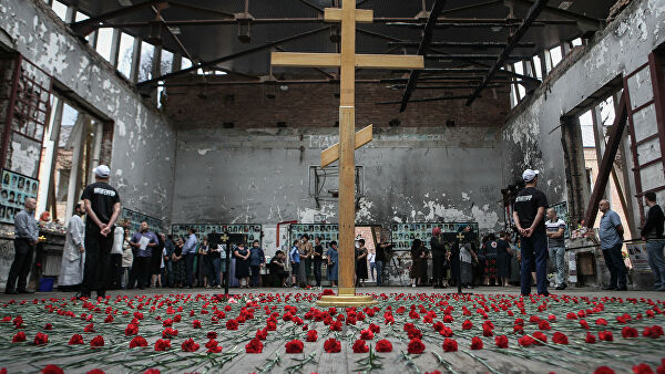 На фото - крест, установленный на месте теракта в сентябре 2004 года в школе г. Беслана.