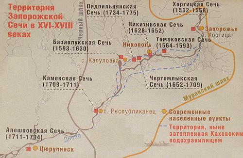 Местонахождение Запорожской Сечи в разные периоды её истории