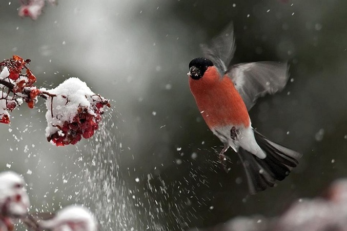 Ветер иней сорвал,... снегирь веселится.