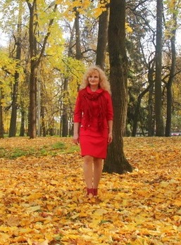 В огненно-красном роскошном наряде.