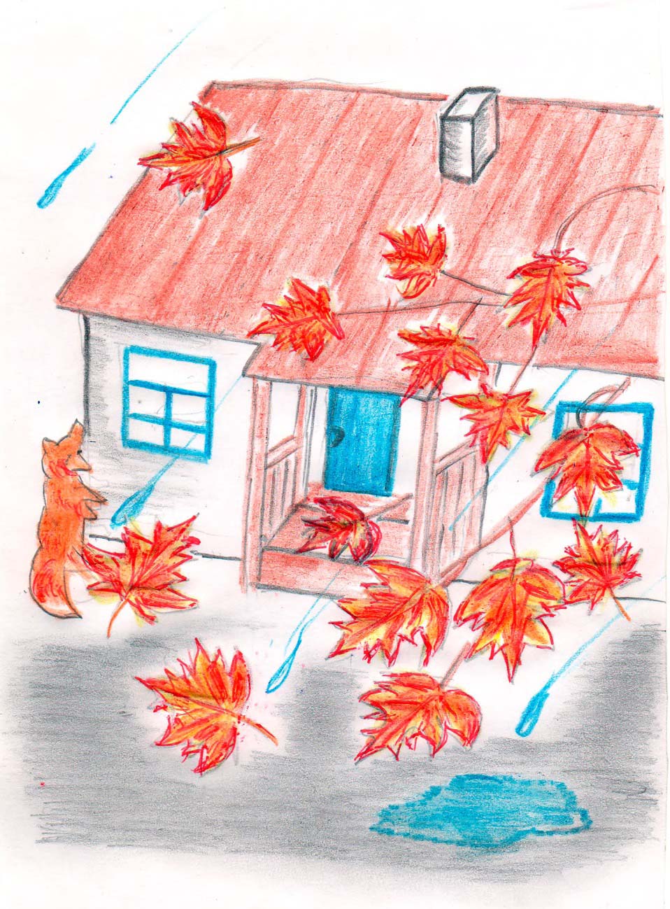 На крыльце кленовый лист,