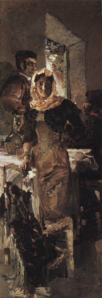 В руке край скатерти, глаза устремлены;