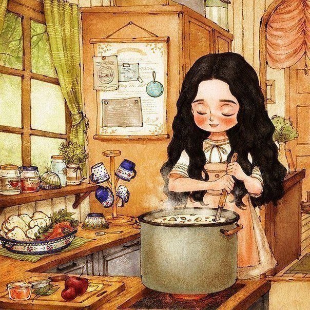 Она с утра на кухне.