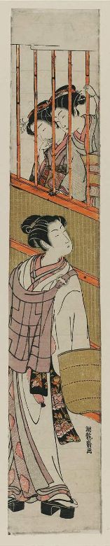 Исода Корюсай. Две девушки смотрят из окна на юношу в одежде комусо. 1774
