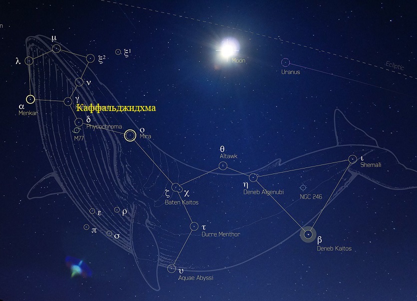 Каффальджидхма – звезда, 86 гамма созвездия Кита, расстояние до Солнца – 20.8 парсек. С арабского – раскрытая ладонь.
