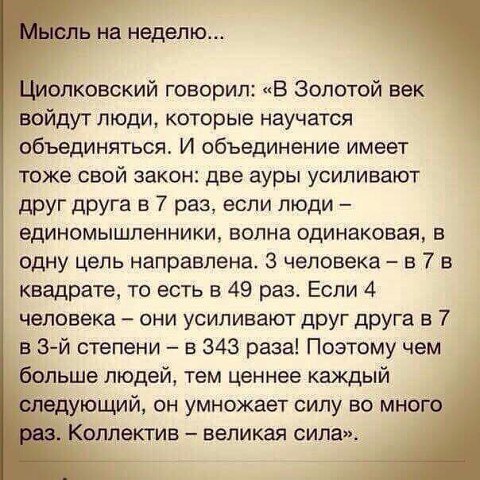 Поэтому чем больше людей, тем ценнее каждый следующий, он умножает силу во много раз. Коллектив – великая сила!»