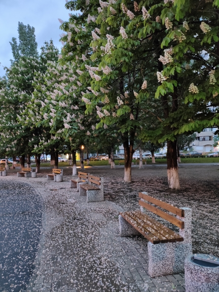 И снегом каштанов засыплет скамейки,
