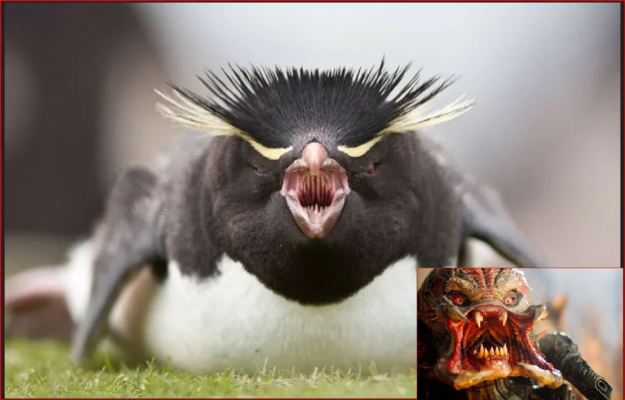 Большое фото - королевский пингвин в Антарктиде, маленькое фото - космический выродок из фильма "Хищник"