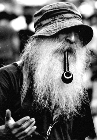 с седой причёской старец, столб
