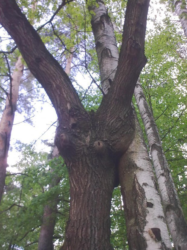 На коре глаза и рот.