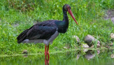 Черный аист - крупная птица, размером больше серой цапли. Вес тела - 3кГ, размах крыльев 185 - 205 см. В полете шею держит вытянутой, как журавль. Окраска оперения сплошь черная, с сине - зеленым и медно - красным блеском у взрослых птиц, а у молодых окраска темно - бурая, тусклая. Нижняя часть груди и брюхо белые. У взрослых аистов клюв, кожа вокруг глаз и ноги красные, у молодых - зеленовато - бурые. Самец немного крупнее самки и в паре выглядит ярче. В отличие от белого аиста, черный избегает соседства с человеком - это житель глухих лесов с обширными болотами и лугами. Занесен в Красные книги Белоруссии, Болгарии, Казахстана, Украины, Таджикистана и РФ.