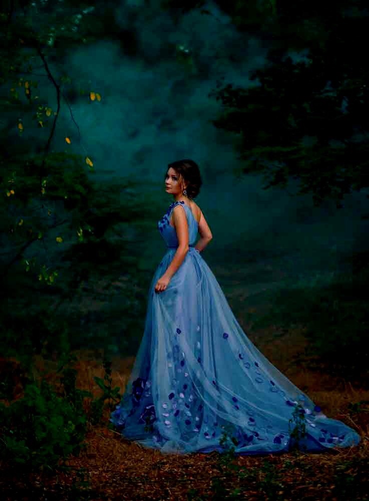 И платья шлейф среди деревьев