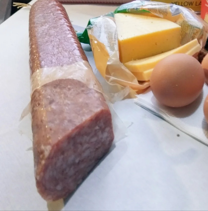 Бутер ползёт с колбасой по столу.