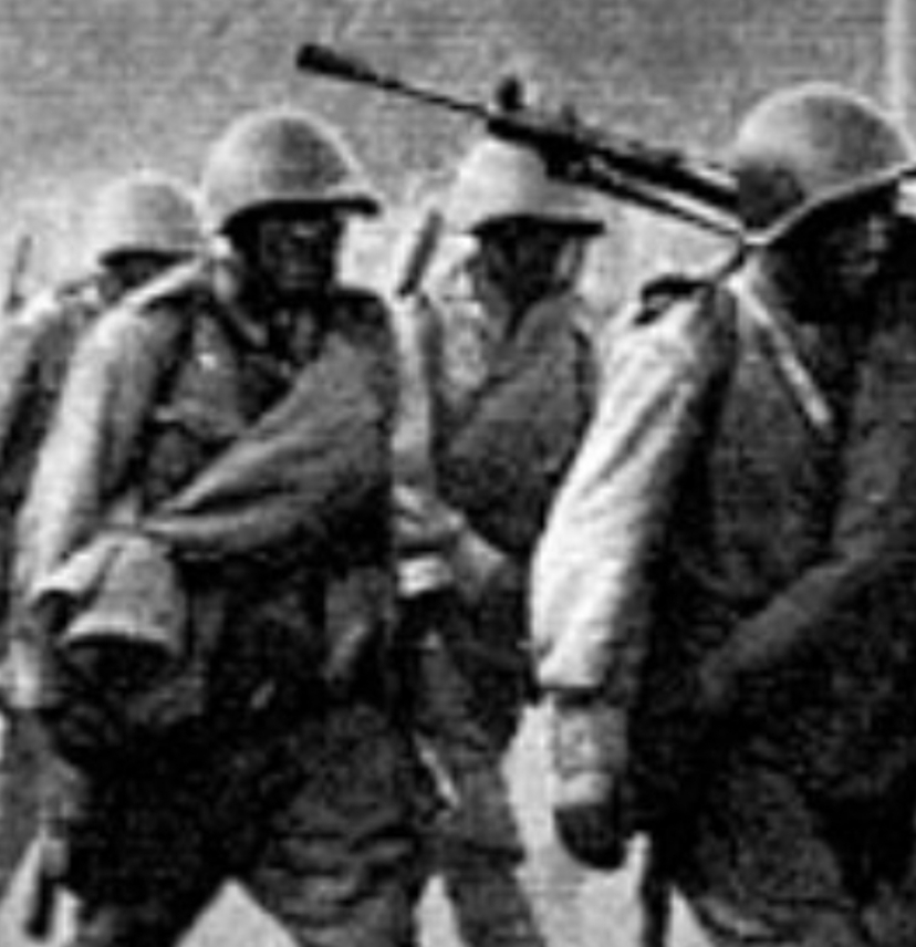 Понуря головы,в руках винтовки.