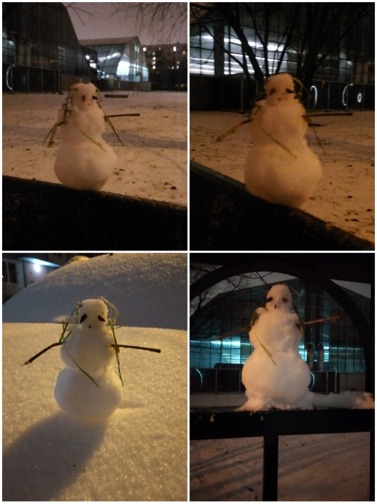 И вот сегодня после полудня с небес посыпался первый серьезный снежок. Поздним вечером его набралось достаточно, и часов в десять не выдержав, я выбежала на улицу, чтоб вдохнуть тот особый, помягчевший после выпавшего снега воздух, и слепить хоть маленького, но снеговичка, пусть притягивает зиму, снегопады, радость и чистоту , да простят меня за это желание наши местные дворники!