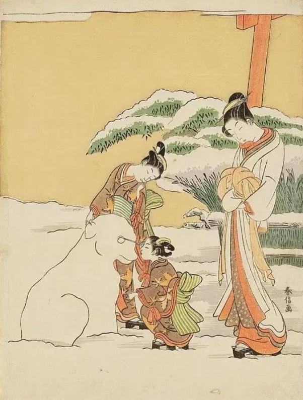 Судзуки Харунобу. Куртизанка наблюдает, как камуро лепят снежного пса. 1767