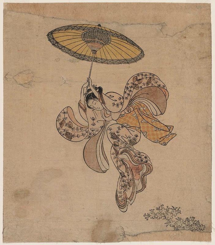 Судзуки Харунобу. Молодая женщина прыгает с балкона храма Киемидзу