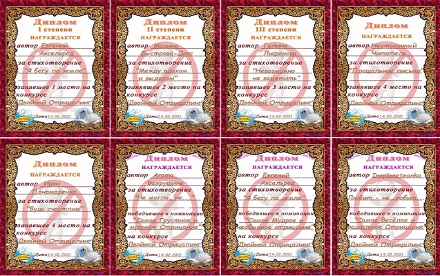 Поздравляем Евгения Аксельрода, Марину Быстрову-Докс, Галину Лифанову 2, Неутомимого Читателя, Ирэн Пономаренко, Инопланетянку и Агату Бахрушину с заслуженными призовыми местами и публикуем на всеобщее обозрение копии почётных именных дипломов, которыми они награждены!