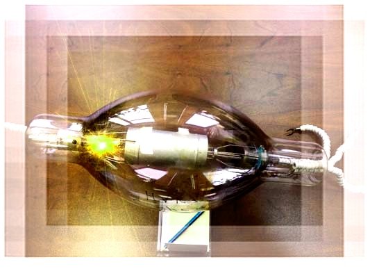 Но такую ЛАМПУ я увидел впервые. Стеклянный цилиндр с утолщением посередине имел объём примерно с трёхлитровую банку, толстенные инваровые выводы, а провода накала были в керамических бусинках, как ныне уже забытые спирали в утюгах…