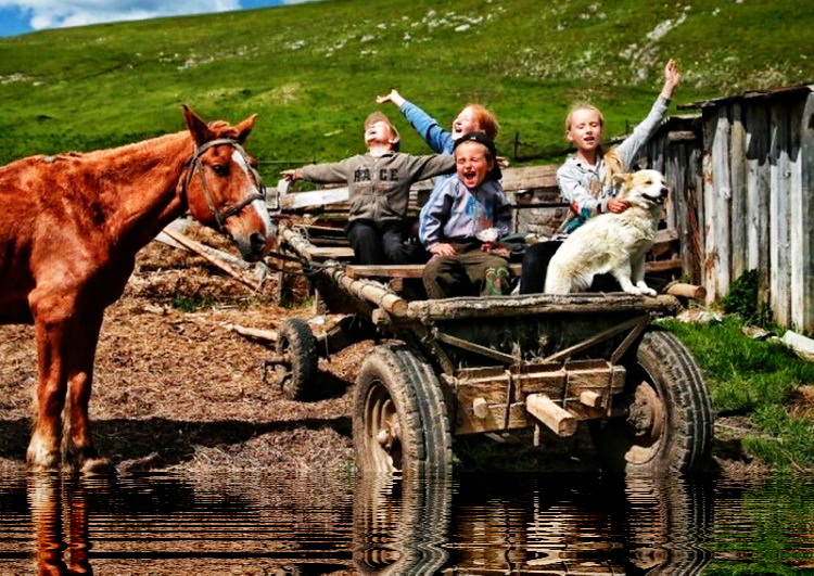 А в телеге поют песни ребятишки