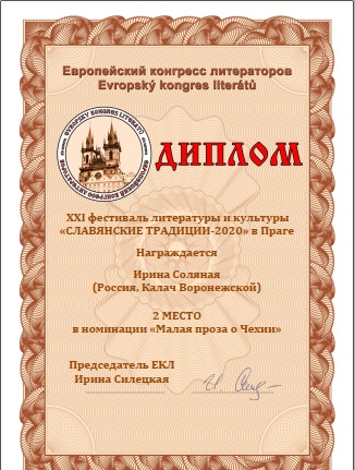 В номинации "Малая проза о Праге" СОЛЯНАЯ ИРИНА заняла 2 место.