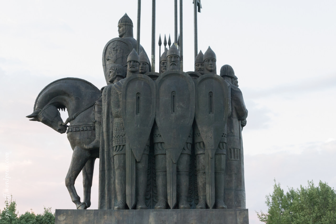 И чудится мне, что не памятник это уже, а древний православный храм, всеми своими линиями устремленный в небесную высь. Шлемы у дружинников подобны куполам церквей, над которыми возвышается один, самый большой и главный - шлем святого благоверного князя. Тесно поставленные прямые мечи, щиты воинов кажутся строгим церковным фасадом с полукружием апсид и узкими щелями окон, а рисунок на их одеждах напоминает поясок - орнамент, хорошо знакомый по белым псковским храмам...