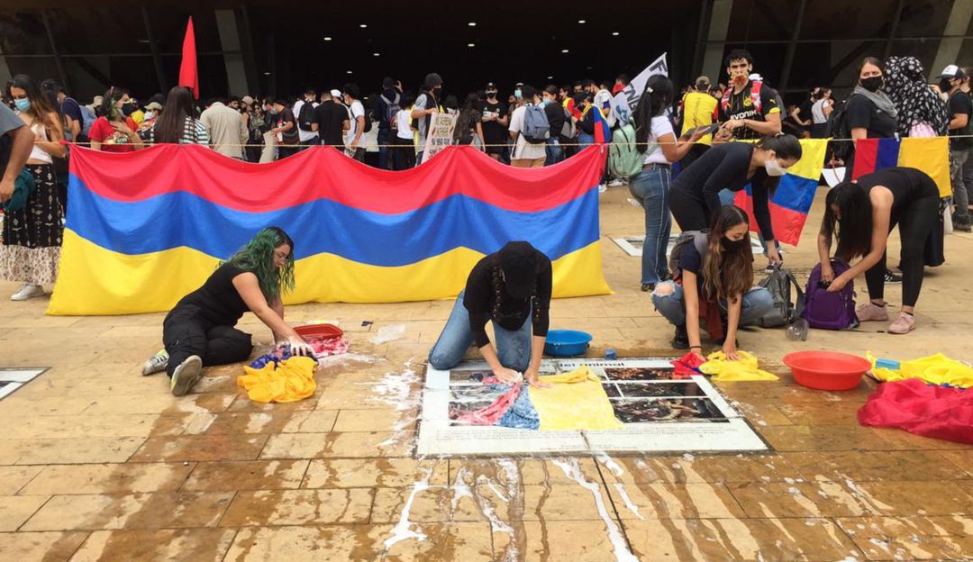 Artistas de Medellin lavan las banderas de Colombia en un acto simbolico por la sangre derramada en el pais por cuenta de la violencia y la corrupcion.