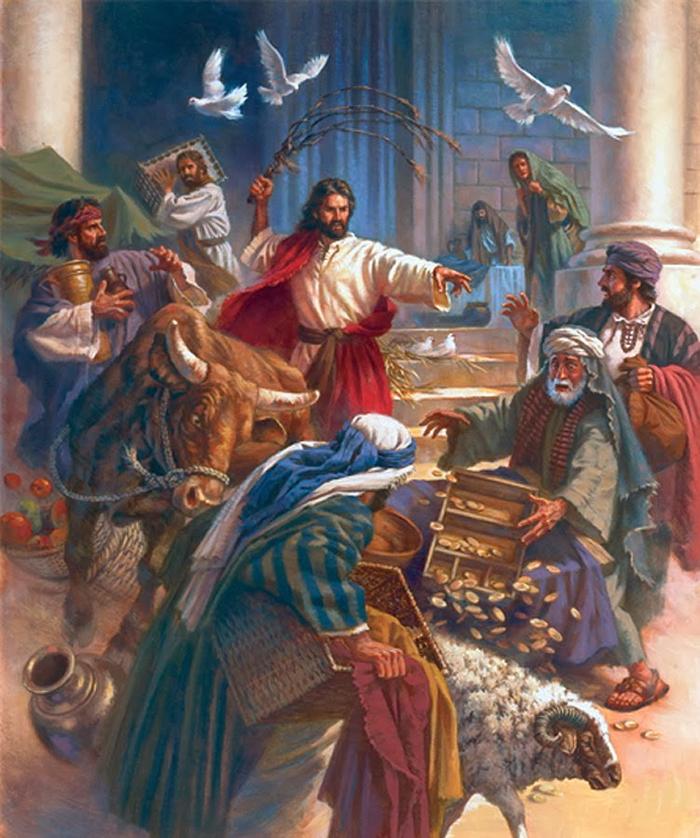 из церкви всех овец, волов, –