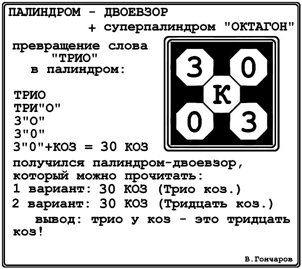 Палиндром двоевзор. (плюс суперпалиндром «ОКТАГОН»)