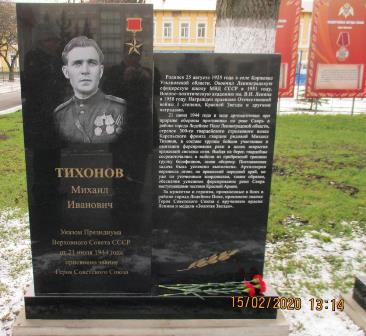 Указом Президиума Верховного Совета СССР от 21 июля 1944 года за образцовое выполнение боевых заданий командования и проявленные при этом геройство и мужество гвардии красноармейцу Тихонову Михаилу Ивановичу присвоено звание Героя Советского Союза с вручением ордена Ленина и медали «Золотая Звезда».