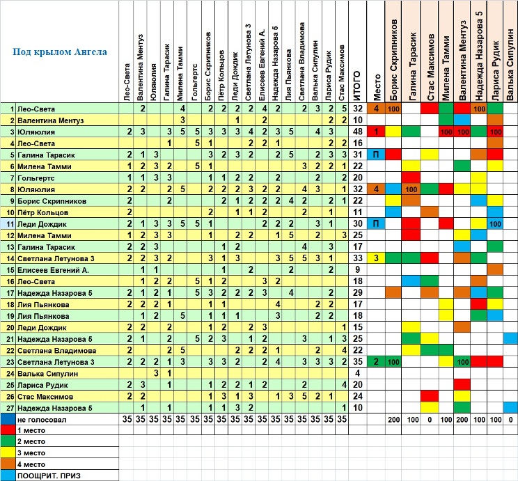 На ПЕРВОМ МЕСТЕ с большим отрывом стихотворение ЮЛЯЮЛИИ (№3), набравшее 48 голосов участников конкурса. Приз 600 баллов! – Авторы Валентина Ментуз, Милена Тамми и Лариса Рудик сделали свои ставки на 1 место стихотворения Юлии – и они оказались правы!