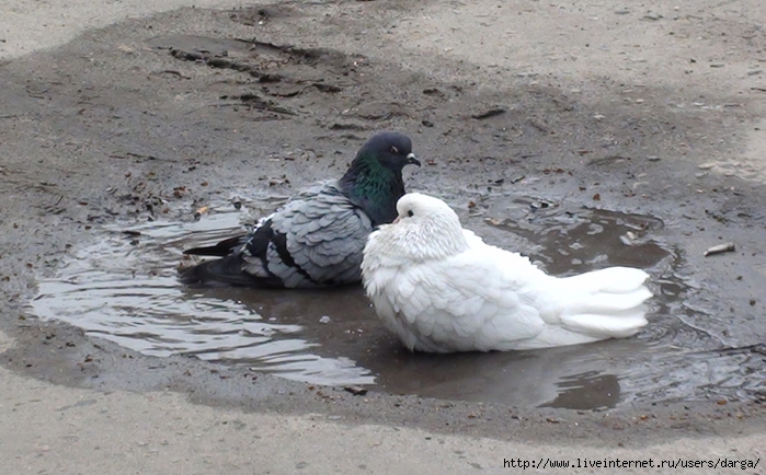 Голубка с голубем над лужей