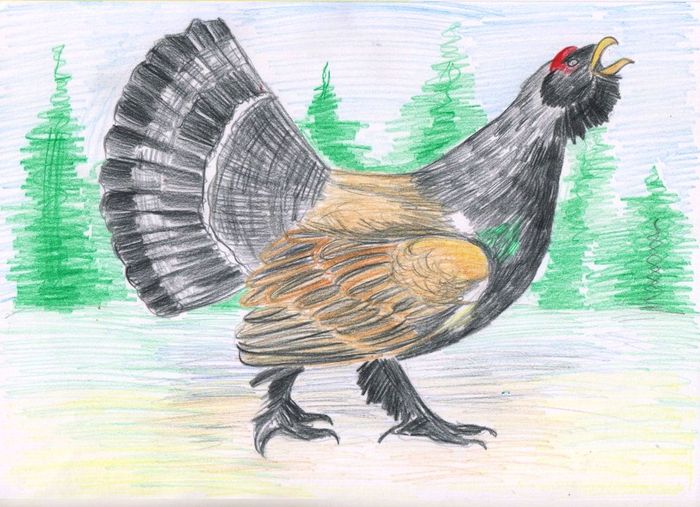 Он более правильный, чем стихи. Глухарь токует на открытом месте на фоне непобедимой чащи.