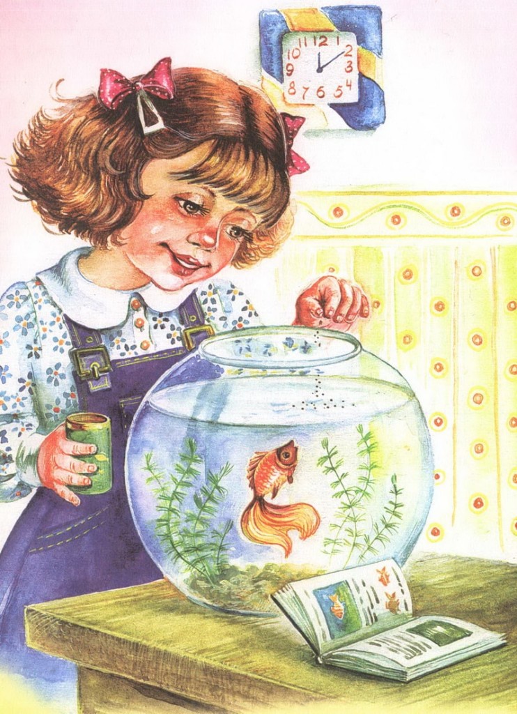 И садочком с банки рыбок всех перенесла.