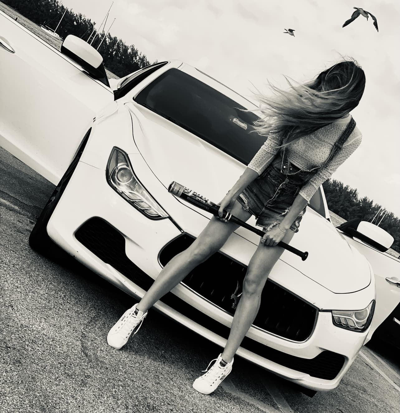 Джинсы рваные, кеды блестящие.