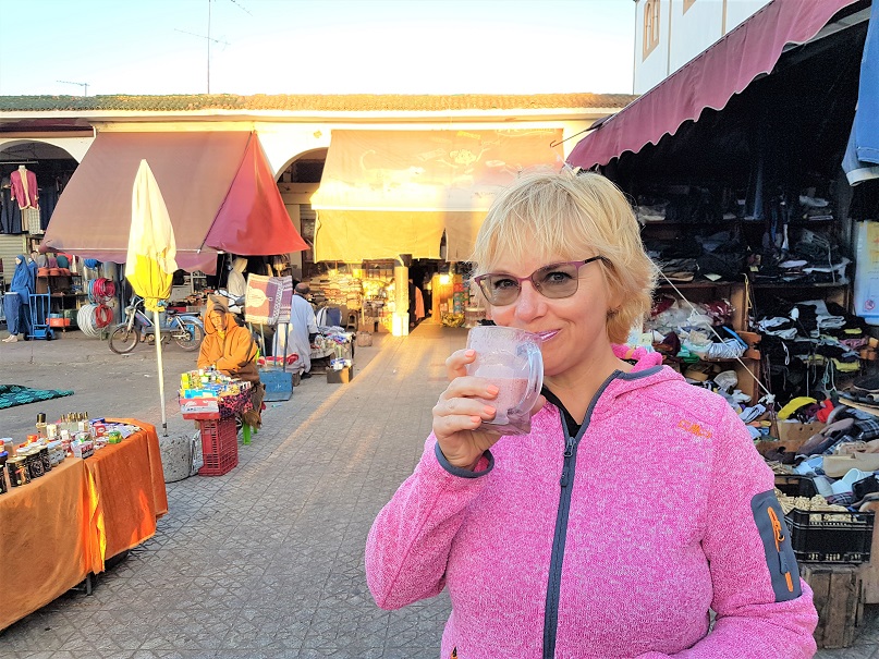 Заказываем в ресторанчике марокканский суп, который ели с финиками - здесь он стоит 35 дирхам, в то время как в Сиди-Ифни всего пять. Тут же туристические цены, что мы хотим?! Но зато ещё на тарелочке принесли хлеб, оливки и можно заказать кофе. Официант дарит мне розу и зарабатывает свои чаевые. Спрашивает: "Откуда мы?" Говорит, что на курорте сейчас в основном отдыхают поляки.