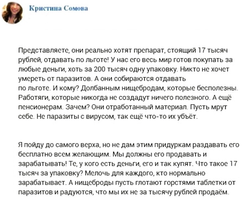 "Пенсионеры — отработанный материал, пусть мрут, их не жалко. Если не давление с сердцем, так что-то еще их убьет. Нет смысла тратить деньги на стариков!"