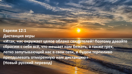 «Итак, нас окружает целое облако свидетелей! Поэтому давайте сбросим с себя всё, что мешает нам бежать, а также грех, легко запутывающий нас в свои сети, и будем терпеливо преодолевать отмеренную нам дистанцию» (Евр.12:1 Новый русский перевод).