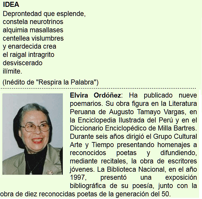 Эльвира Ордоньес (р. 1934) -- перуанская поэтесса, автор 9 поэтических сборников, практикующая синтез и изменение грамматических функций языка (sintesis y por un cambio de las funciones gramaticales en el lenguaje).