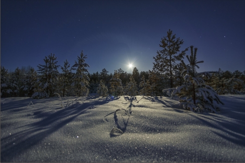 В лучах луны искрится снег.