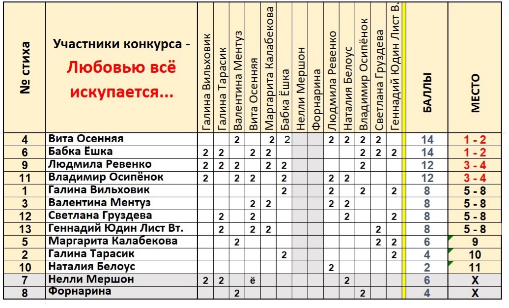 На конкурс было предоставлено 13 стихотворений, проголосовало 12 авторов, за что большое спасибо.