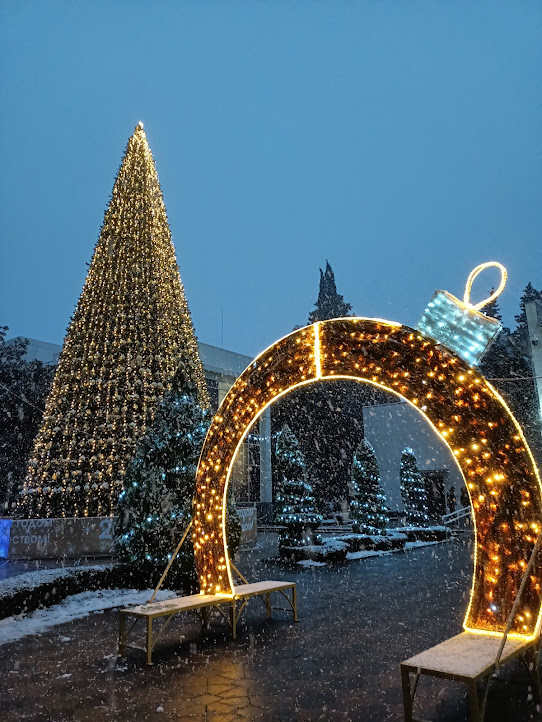 Сумерки опускались на город. И вот вспыхнули множественные яркие разноцветные подсветки: волшебный тоннель из сверкающих гирлянд, светящаяся карета с оленьей упряжкой, переливающиеся радужными красками музыканты, высоченная ёлка с Дедом Морозом и Снегурочкой, а рядом пальмы в настоящем снегу! Волшебство, да и только!