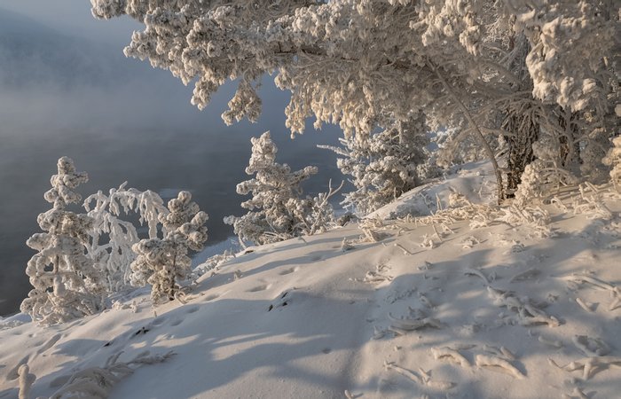 На пологом речки берегу стоят деревья все в снегу. Вот распахнуло солнце сени и пали бликов тени от ёлочек принцесс, преобразился сразу лес. Узоры синеватые и снег пушистый ватою примят слегка ветрами и, где-то со следами зверей: лисы, куниц, не перелётных птиц: сороки, глухаря, и волка стрелка втихаря. Стоят малютки ёлки- все в бахроме иголки, узорчатой и колкой. На них изящны шубки, здесь нету леса рубки. И первозданная природа, как заповедник, для народа. Ствол ёлки старожилы могучий с виду он, имеет ёлка силы цепляться за скалу, ветрам открытый склон. И, словно на балу, прекрасные принцессы, нарядные, живые, не страшны им процессы природные , любые. И свод небесный серо-голубой и слышен вьюги где-то вой. Ветра накренили стволы, пускай ещё малы, так коротают ночи, дни -они волшебницам сродни.