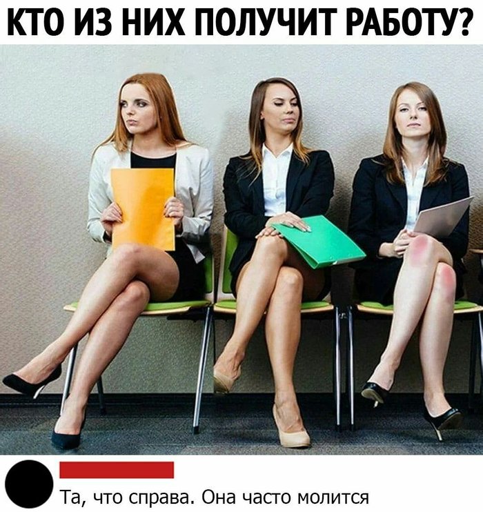 Три свободные красотки, видно сразу, что погодки, на одно видать лицо. Не промолвив ни словцо, сидят чинно , ждут они и без всякой болтовни. На беседу с боссом видно. Нога на ногу- не стыдно. Не пройдут, тогда обидно. В середине с любопытством на соседку смотрит слева, и с презрением, ехидством, мол нашлась тут королева. Истоптала все колени, под глазами туши тени. Что молилась ночку всю и в прикиде только "Ню" Слева- гордая осанка, гордый вид её приманка, сразу клюнет босс, конечно, заместитель и бесспорно, вид серьёзный , безупречна и не вздорна, покорит мужчин без порно. Справа вздорная рыжуха," ни пера ей и ни пуха", на вопросы все ответит , референт ей точно светит -секретаршею у босса, она видит дальше носа. В руках папочки с досье, нет у девушек рантье, нету жвачки, монпансье за щекою иногда, нет работы, нет труда. Кому всё же повезёт? Свой откроет в банке счёт. Всё зависит тут от босса, от его сегодня спроса.
